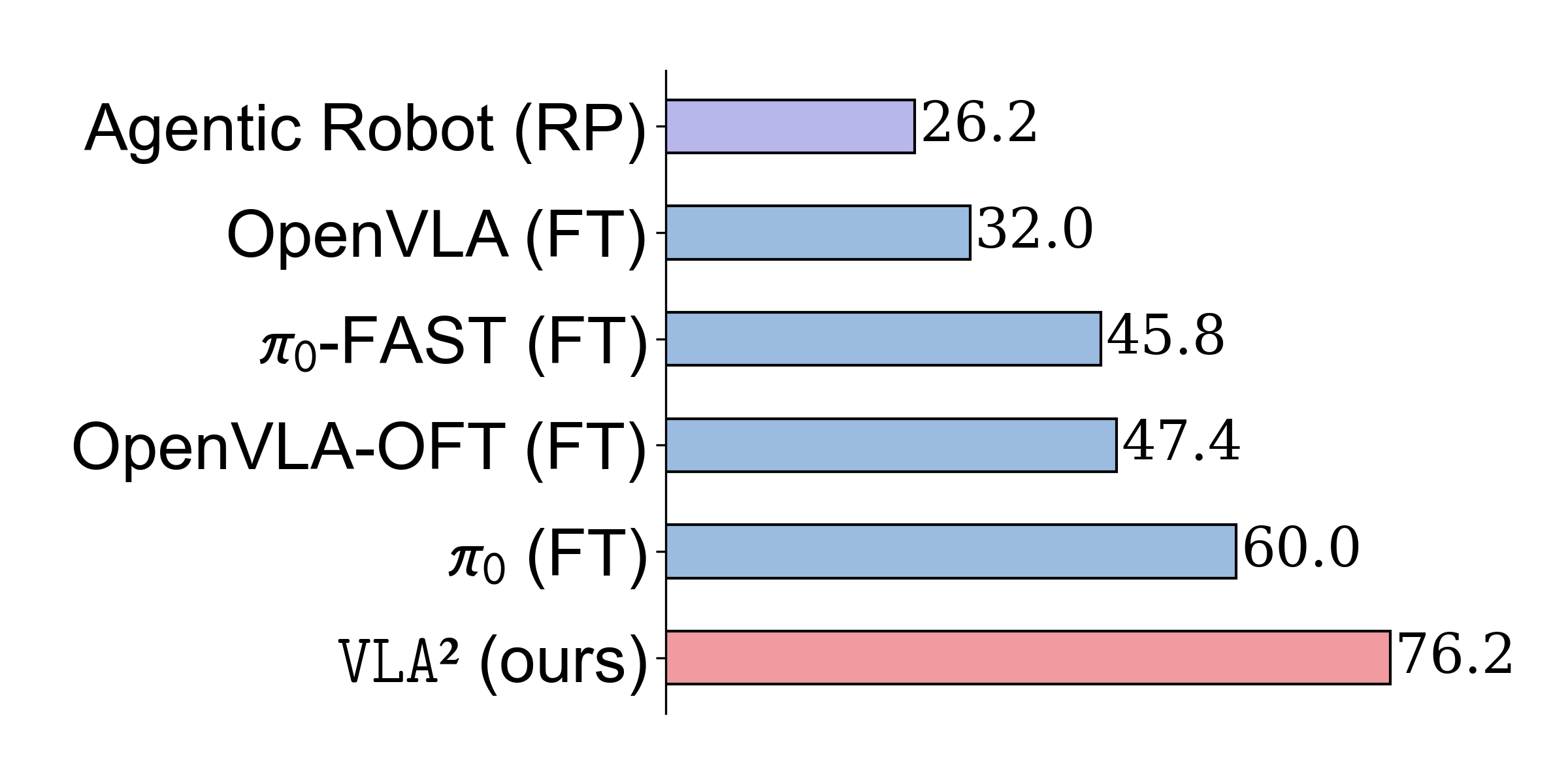 As the benchmark difficulty increases, all baselines exhibit a significant decline in task success rates, while VLA² demonstrates a clear advantage on tasks that require strong generalization capabilities.