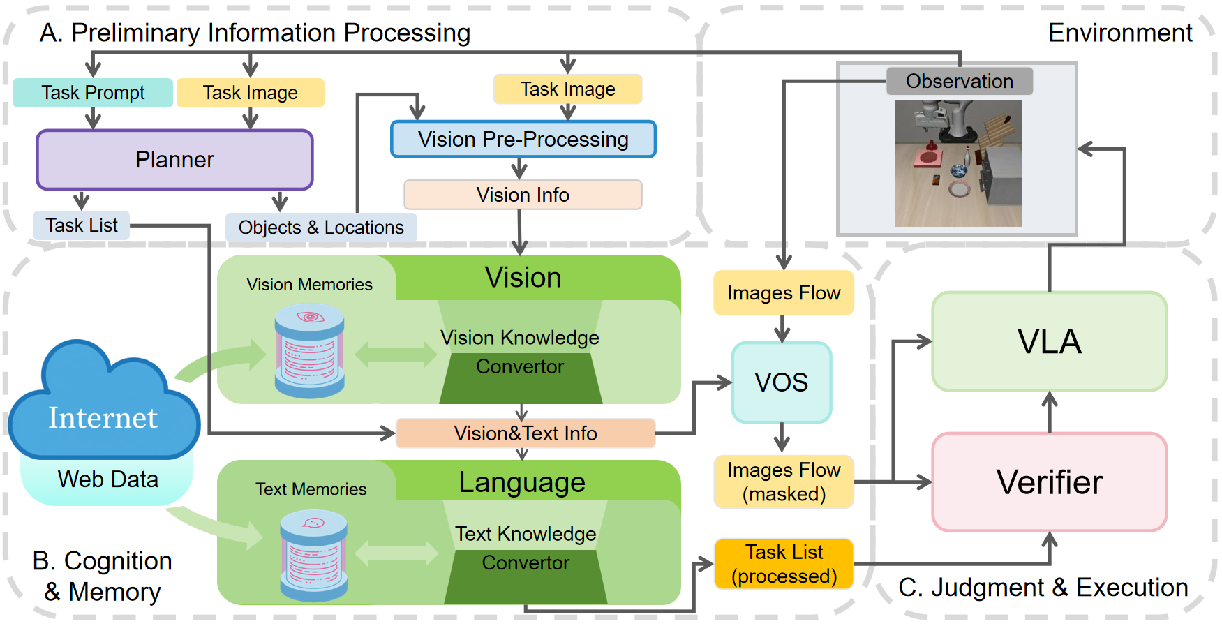 VLA² integrates these modules to enhance the ability of VLA: Task Planning, Web/Memory Retrieval, Object Grounding, and Result Verification. Each module implements its function through one or more foundation models.
